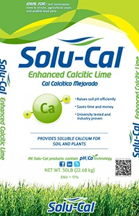 Solu-Cal Enhanced Calcitic Lime is a brand of calcium-enriched lime for quick and efficient soil adjustment. Solu-Cal works to adjust soil pH in as little as 6 to 8 weeks. The use of patented PHCA Organic Humic/Fulvic Acid Technology in Solu-Cal significantly increases the availability of applied and stored nutrients in the soil.