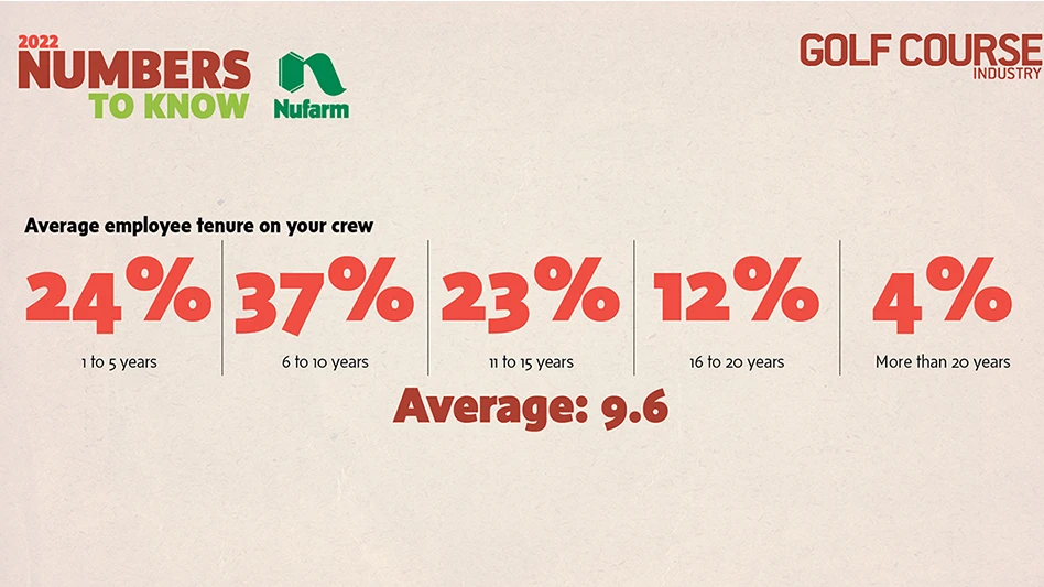 But the average crew, at least among the respondents to our annual survey — which focused more on labor this year after shining on a light on the response to the pandemic pickup in 2021 and the personal toll of turf life in 2020 — includes 7.80 full-timers, 3.48 part-timers, and 6.99 seasonal employees. (The medians are 5.00, 3.00 and 5.00, respectively.) The average tenure for a full-time crew member is an impressive 9.6 years.