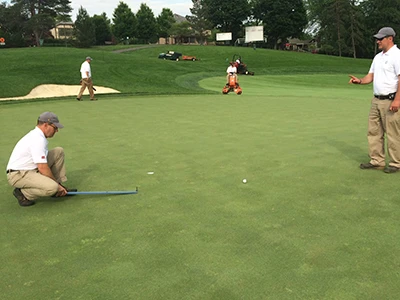 This marks Hammond’s second stint as a Memorial volunteer. He also helped the Muirfield Village crew in 2011, but he’s spending more time this year observing the data collection associated with conducting a high-level event. PGA Tour agronomist Paul Vermillion is a staple in the maintenance facility, where he enters stimpmeter and firmness readings into a laptop. The numbers Vermillion processes, especially those associated with the greens, are startling.