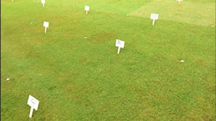 Plots change as the marketplace shifts. A combination of the recent economic downturn and lingering drought in multiple regions has increased the demand for varieties that require fewer inputs. During the field day, Bonos explained the intriguing trials being performed on fairways using a fine fescue/colonial bentgrass blend. Divot recovery and wear tolerance are major concerns involving fescue fairways, and the next step for Bonos and her team involves using a divot simulator constructed by Glenwood (N.J.) Country Club assistant superintendent Mario Gagliardi to examine recovery rates.