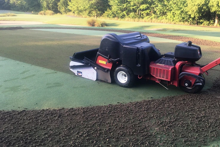 Mowing early in the morning can remove dew from the turf prior to aeration and can also reduce mud buildup, Behan says. “The process would be mow, throw the topdressing down, aerate, then go back and brush the balance of the topdressing back into the holes, then move onto the next hole,” he says.