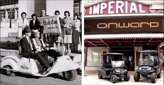 In celebration of its 60th year in business, Club Car recently revisited the Imperial Theatre in Augusta, Ga., to debut its Limited Edition Onward vehicles which showcase modern comfort, performance and style. The global leader in golf and utility vehicles first revealed its Club Car (left) when founder Bill Stevens in 1962 drove to the theatre to celebrate moving the company he purchased (the Landreth Machine, based in Dallas) to Augusta. Stevens in the straw hat and his father, Bill Sr., drove to the 1962 PGA Show in Dunedin, Fla., in six days.