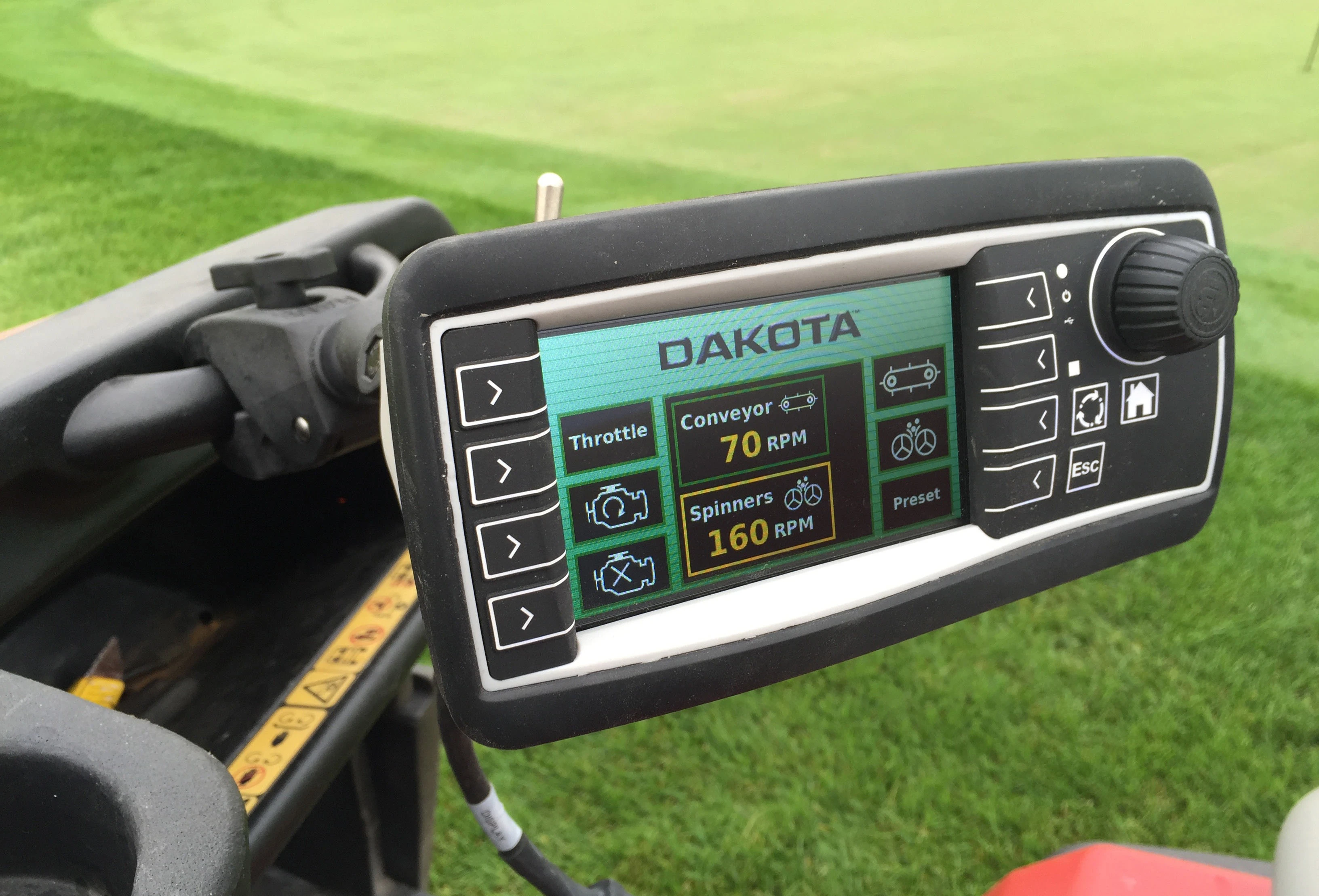 The 2016 model of the Dakota 410 topdresser features a state-of-the-art control box with four customizable memory presets. This industrial grade control unit features a 4.3-inch LCD display that precisely controls belt and spinner speeds, engine start and stop, throttle settings, brakes and hopper vibrator.