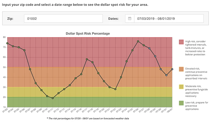 Once a superintendent signs up, they will receive their first notification of the season when dollar spot pressure in their area is forecasted to reach a 20 percent risk threshold in the next five days, which will help them prepare for a preventive fungicide application. After the first alert, superintendents can also elect to be notified of their dollar spot risk on 7-, 14-, 21- or 28-day intervals.