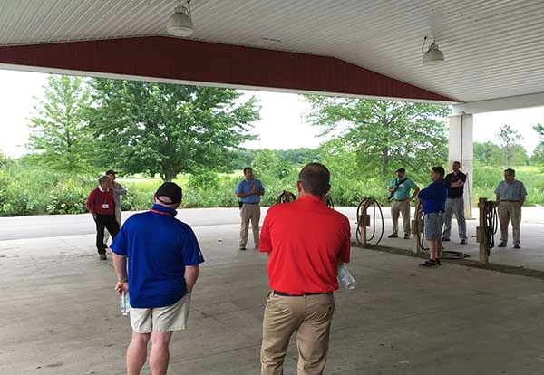 No more results found. Our group consisting of Ohio Turfgrass Foundation members meets Double Eagle COO Todd Voss at the old maintenance building. Before businessman John McConnell decided to build his dream golf course, the light blue structure housed horses. Double Eagle owns a Galena, Ohio, address. Galena was farmland when the course opened in 1992. Today it’s considered part of the bustling and expanding Columbus metropolitan area.