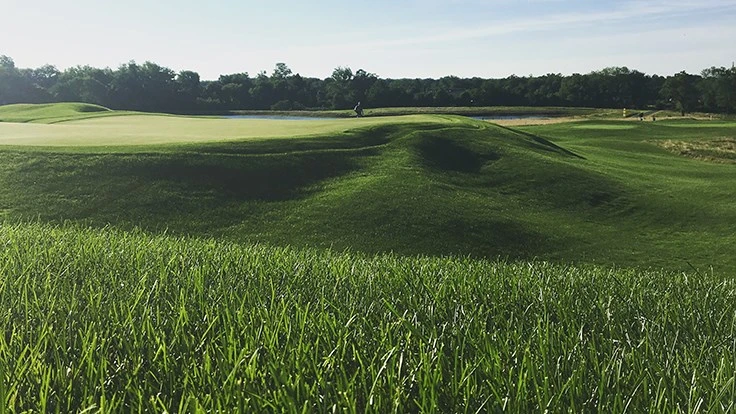 High heat and humidity, along with heavy red clay soils, lead to challenges with dollar spot on bentgrass fairways during summer months. "I would spray a lot less if it weren't for those conditions," notes Lewis, who holds a degree in turfgrass management from Ohio State University. "All things considered, fairways drain pretty well because of comprehensive subsurface drainage installed during grow-in."