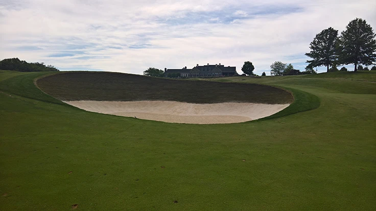 “We have combined Durabunker with liners such as Capillary Concrete and Blinder Bunker Liner on a number of courses, mainly where design dictates much shallower edges with higher sand faces, the likes of which we have built on many inland courses,” Lewis said. “This type of bunker design offers sealed revetted edges usually between 6 inches and 12 inches, meaning that an inland venue benefits from all the advantages of Durabunker, whilst not necessarily building traditional sod wall bunkers. This type of design is becoming increasingly popular, though at Fieldstone the more traditional sod wall bunker is certainly central to the character of the course and in fact the bunker wall on No. 18 is the largest we have built to date, at 650 square feet. It was also the first time we have collaborated with BBB. And as with other liners, the two products worked together perfectly – BBB being used in the base and for the lower incline of the wall with Durabunker stacked directly on top to build the sod wall itself. This combination addresses pretty much every bunker issue that exists from base through to tip of the bunker wall and results in virtually maintenance-free bunkers that have outstanding longevity and durability.”