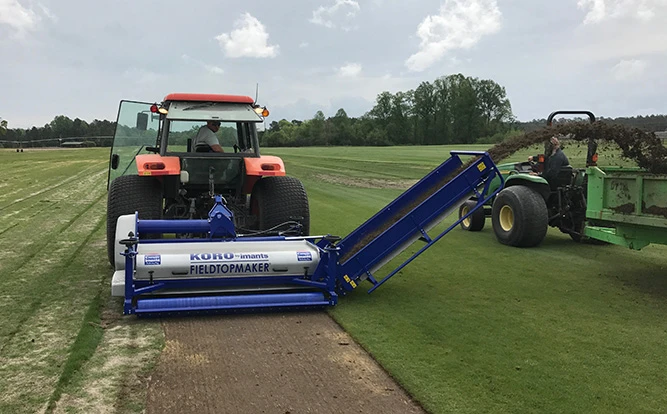 Sam Green: It depends on the size of the KORO by Imants Fieldtopmaker being used. But most people in the golf market use either a 1.2-meter or a 1.5-meter machine. That’s a 55- to 60-horsepower tractor or less. You need to have some sort of dump trailer and you probably want two or three of those that are running beside to speed the process up. That’s really it, and a tractor blower when you are done and start the grow-in program. And, for us, the Campey Imants piece is the Universe rotor with either the 10-millimeter teeth or the 5-millemeter teeth depending on the aggressiveness and what you want to do. Fraze mowing is the 10-millimeter teeth and being able to get after it, and in the ‘finesse’ mowing piece of the puzzle, we’re using the 5-millemeter blade and not going after it as aggressively. We have been doing some work with NC State the last two years and it was presented at the field day this year – the Fraze mowing and ‘finesse’ mowing piece of the puzzle and that’s with the Universe rotor on the KORO by Imants Fieldtopmaker.