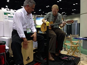 Underhill's Franc Ortega doesn't miss a beat. Ortega jammed on his cajon with guitarist Jimmy Moore yesterday during Underhill's afternoon Tailgate Party reception. Ortega and Moore's Latin vibe range through the Golf Industry Show yesterday afternoon and would make one think that the two had played together for years. In fact, the two had just met that afternoon.