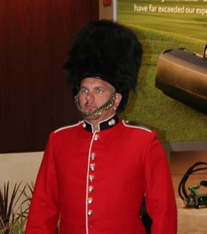 Happen to catch those British Royal Guards posted, motionless and stern outside the John Deere Golf booth at GIS?