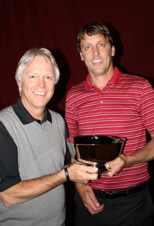 IMAGE: Steve Smith, president of presenting partner Smith Turf and Irrigation, presents the trophy to golf champion Steve Agazzi from the Turtle Point course at Kiawah Island Resort.