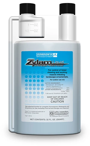 Zylam Liquid, which contains dinotefuran, is a soluble liquid labeled for the control of chewing and sucking insect pests such as armored and soft scales, aphids, borers, thrips, lace bugs and whiteflies in trees and shrubs.