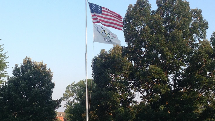 Two flags fly outside the Glen Echo Country Club pro shop. The top flag honors the United States. The bottom flag displays the world’s five most recognizable rings.