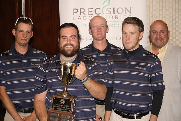 (Pictured: The victorious team from Horry-Georgetown Technical College of Mike Haviland, Mark Blackwelder, Zach Davis and Tim Moore with Turfbowl moderator Bo Barefoot of Precision Laboratories.)