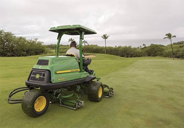 Released in 2014, the 8000A E-Cut includes a three-wheel configuration. John Deere Golf manager, product marketing Tracy Lanier says the mower leaves an after-cut appearance comparable to a triplex while offering increased productivity associated with an 80-inch width of cut. The mower receives extreme tests on the Big Island, where severe fairway and green contouring is common among courses constructed on hilly terrain and lava rock such as Mauna Kea and Nanea.