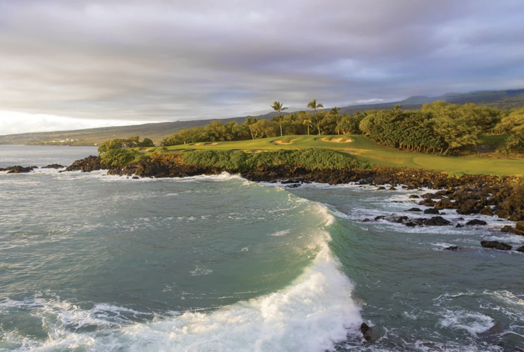 Instincts point the body east, facing a meandering par-4 with a view of a modest clubhouse boasting five copper roofs signifying volcanic vents, landscapes natives call pu’u. Mauna Kea, a snow-covered 13,796-foot mountain, towers in the same direction.