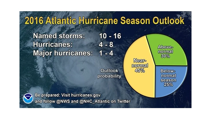 NOAA’s Climate Prediction Center says the 2016 Atlantic hurricane season, which runs from June 1 through Nov. 30, will most likely be near-normal. However, forecast uncertainty in the climate signals that influence the formation of Atlantic storms, make predicting this season particularly difficult.