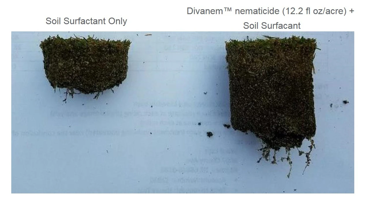 Divanem protects roots from nematode damage so root system quality and mass can increase drastically. Deeper, denser roots allow for healthier turf that can quickly recover from stresses like disease, drought and aerification.