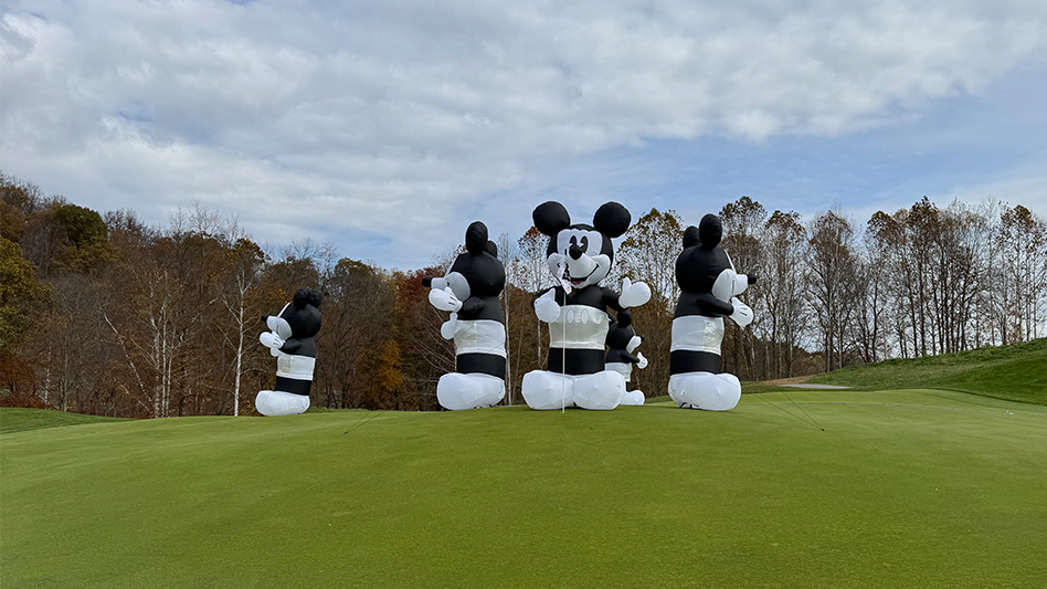 Six members of the Pete Dye Golf Club agronomy team completed their final morning assignment at 10 a.m. on Sunday, Nov. 2. They immediately gathered photos and videos of the finished work. As a team, they appeared stuck in the comical moment as five towering Mickey Mouse inflatables jumbled the17th green.