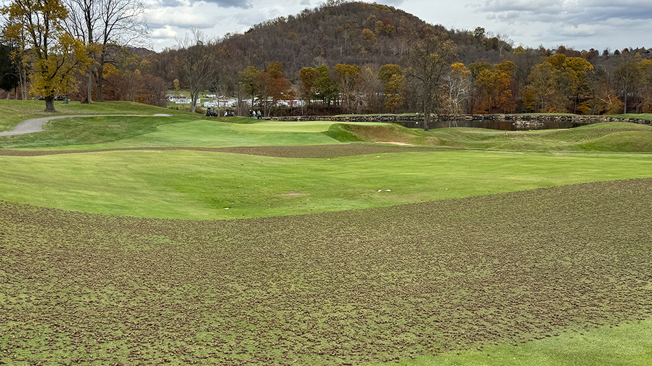 Perhaps nothing peeves golfers in limited golf climates more than the disruption caused by aerification, another necessary investment to ensure healthy, high-quality surfaces. Before play started, Hollen’s team aerified the landing zone and left cores scattered on the short par-4 third hole. From the fresh cores, golfers hit second shots to a hanging back-right hole location guarded by severe greenside bunkering and steep slopes.