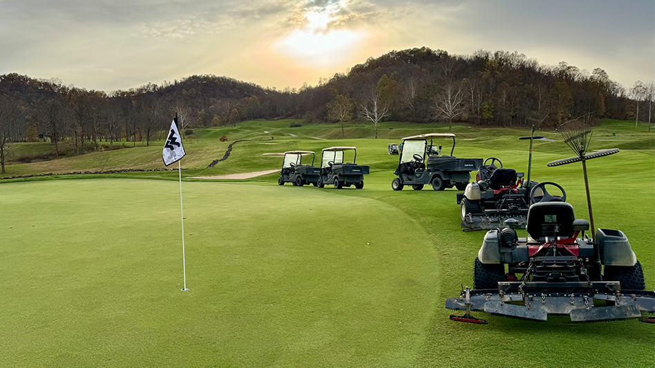On the 14th hole, a par 4 with three large bunkers extending from the right side of the fairway to the green, three utility vehicles and two mechanical bunker rakes parked in front of the green protected a left-edge hole location. On the 15th hole, a risk-reward par 5 with water right, three fairway mowers lurked in a landing area for drives and two rough mowers rested in a strategic layup zone. Parking equipment on the course demonstrates to stakeholders the capital investments required to maintain a golf course.
