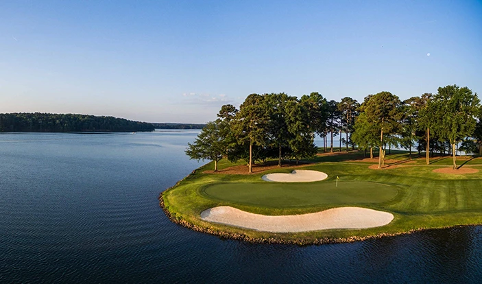 The back nine is a completely different experience, as the final eight holes are on Lake Oconee. Playing on the lake-encircled peninsula, the back-nine holes include the short par-4 11th, where the green juts into the lake, causing left-side hole locations to make the flagstick appear to be floating. The par-3 14th is one of the most photographed holes in the Southeast, its green sitting along the Lake Oconee shoreline.