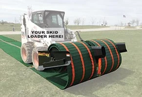 SlatTrax is a ground protection system for your skid loader that rolls out or retrieves up to a 100-foot temporary roadway in about two minutes. The system includes a hydraulically-powered attachment that holds dual spools of Trax — each 36” wide or 42” wide — up to 100' in length. Break-point sections in Trax allow for manual maneuvering.
