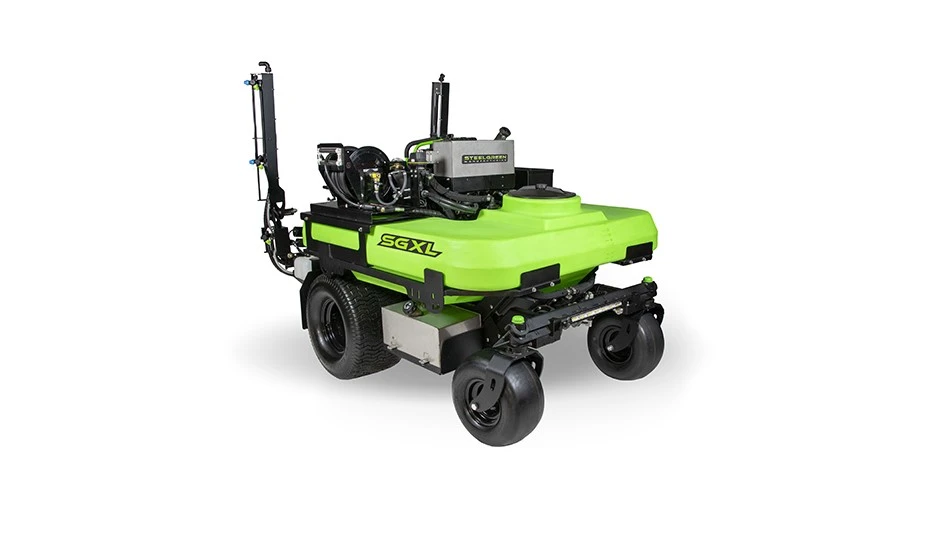 As Steel Green’s largest machine yet, the SGXL has a 120-gallon spray capacity and 14-foot four-section rear breakaway boom with electric-hydraulic lift actuators. The SGXL features a 35-horsepower Kawasaki engine, 100-foot hose reel, 2.5-gallon foam marker, LED light bar, hillside assist system and pressure control system.