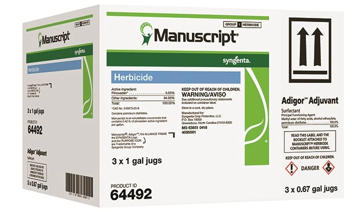 Manuscript is packaged with Adigor surfactant from Syngenta, which is custom-built for use with Manuscript for improved rainfastness and faster weed control. Using Adigor with Manuscript maximizes the quantity and rate of absorption of pinoxaden, as well as the degree of translocation once pinoxaden is in the plant.