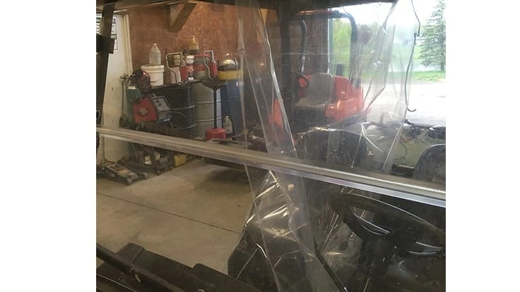 The seasonal maintenance staff came back to work for the summer months at the Kinsale Golf and Fitness Club in Powell, Ohio, where Rob Fisher is the superintendent. Fisher realized he did not have enough turf vehicles for one crew member per vehicle per social distancing guidelines, so he improvised unique cart dividers. He purchased 6-gauge clear plastic for 71-inch by 71-inch shower curtains at Target for $6 each. Golf cart control ropes were placed through the curtain holes and three small set screws mounted the curtains to the tops with ease. Two crew members can now ride together safely divided by also closing the folding windshield. Total installation time took about 20 minutes per vehicle.