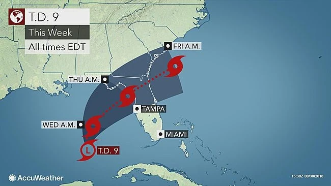Tropical Depression Nine developed just south of Florida on Sunday and will turn toward the northeastern Gulf Coast of the United States later this week, AccuWeather reports. Tropical Depression Nine was the former tropical disturbance 99L.