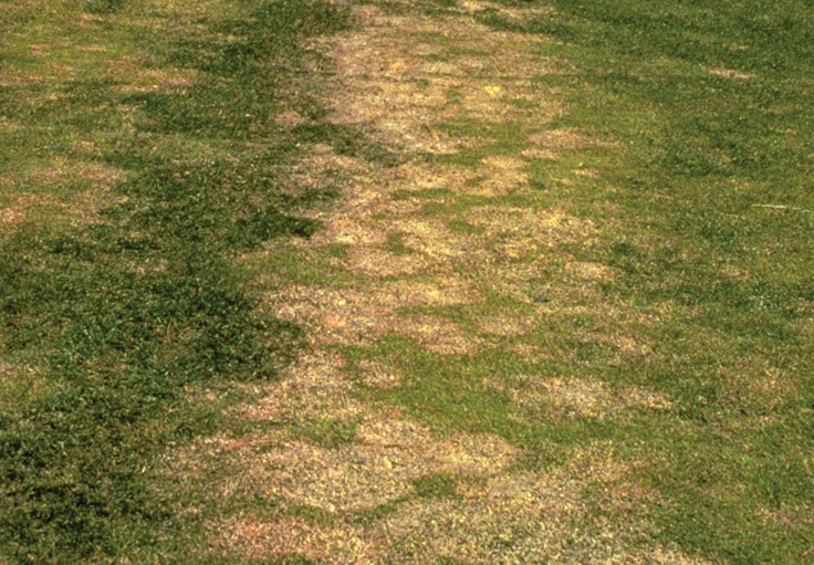 Pink snow mold, caused by Microdochium nivale, occurs in cold (32-50oF) wet weather with intermittent periods of snow cover (less than 80 days). Symptoms are visible at snow melt as tan patches 2-12” in diameter with a pink border. The affected areas change in color to a whitish gray with leaves taking on a bleached appearance. Individual patches may also coalesce, resulting in extensive damage to the turf.
