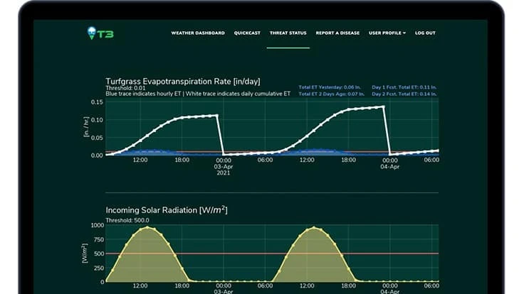 T3 subscribers get access to innovative forecasts such as evapotranspiration rate, soil moisture, soil temperature, plant canopy moisture and frost formation probability. Other features include a comprehensive radar with real-time lightning detection, an alert-driven threat matrix and access to a nationwide disease tracker. Forecasts are created using some of the highest resolution weather data available, enabling T3 to provide pinpoint, course-specific forecasts up to 48 hours in advance.
