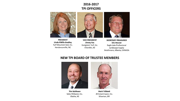 Linda Pittillo Bradley, co-owner of Turf Mountain Sod in Hendersonville, N.C., was elected president; Jimmy Fox, president of Evergreen Turf in Chandler, Ariz., was elected vice president; and Eric Heuver, president of Eagle Lake Professional Landscape Supply in Strathmore, Alberta, Canada was elected secretary-treasurer.
