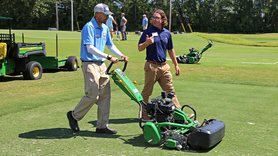 Greenkeeper Apprenticeship Program program director and Sandhills Community College instructor Carson Nesbella, right, works with a GAP participant.