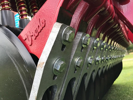The Vredo Compact Seeder series is an accurate and efficient range of disc seeders designed for overseeding golf greens and tees, sports pitches, and other amenity grass. Seed is placed in a V-shaped slit, at a pre-set depth of between 3/16th-inch and 1-inch deep, directly in contact with the soil for maximum germination rate. The slits are then closed by a compaction roller and a level surface re-established. There are four different widths available to suit tractor overlap and all three-point mounted behind compact tractors.