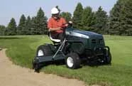 The National 8400, a triplex mower is offered with an optional National Mower’s Vertical Mowing System. A low center of gravity gives the machine control on hills, while a powerful hydrostatic drive easily handles steep slopes. Named the “King of the Hill”, the thin, contoured blade design allows more frequent vertical mowing on berms, bunkers, edging or curbs.