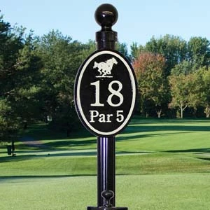 The impressive, new Centennial Tee Consoles are available with vertical oval- or crest-shaped markers,precision-cast in bronze or aluminum and richly accented with black or hunter green backgrounds. The distinctive 10" x 14" markers can be mounted horizontally using classic sign brackets specially fitted for the 3" x 3" square posts, or they can be attached directly to 3" diameter round-ribbed posts. Both post designs stand 8 feet high and come with decorative caps. Additional options include ball washer mounting brackets (with hardware) and complementary multi-colored signage (with hardware) to display each hole.