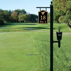 The impressive, new Centennial Tee Consoles are available with vertical oval- or crest-shaped markers, precision-cast in bronze or aluminum and richly accented with black or hunter green backgrounds. The distinctive 10" x 14" markers can be mounted horizontally using classic sign brackets specially fitted for the 3" x 3" square posts, or they can be attached directly to 3" diameter round-ribbed posts. Both post designs stand 8 feet high and come with decorative caps. Additional options include ball washer mounting brackets (with hardware) and complementary multi-colored signage (with hardware) to display each hole.