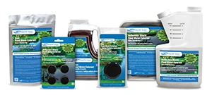 Healthy Ponds Blue Pond Water Colorant and Reflections are both available in five-pack tubs or single foil bags. An individual five-ounce water soluble bag treats up to 500,000 gallons of water. Pourable granules, tablets and pellets are also available.