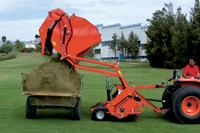Optional multipurpose sweeper head allows for verticutting and flail mowing while collecting clippings in a 3.5-cubic-yard hopper